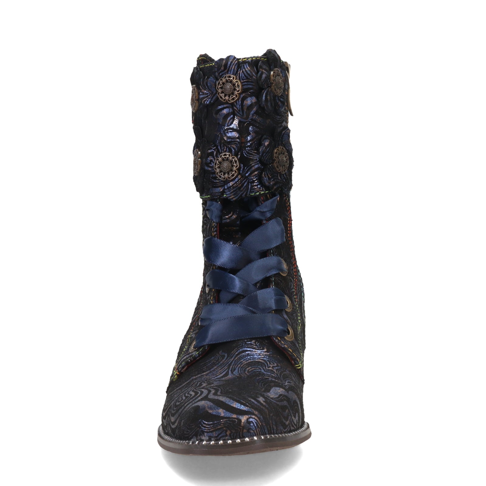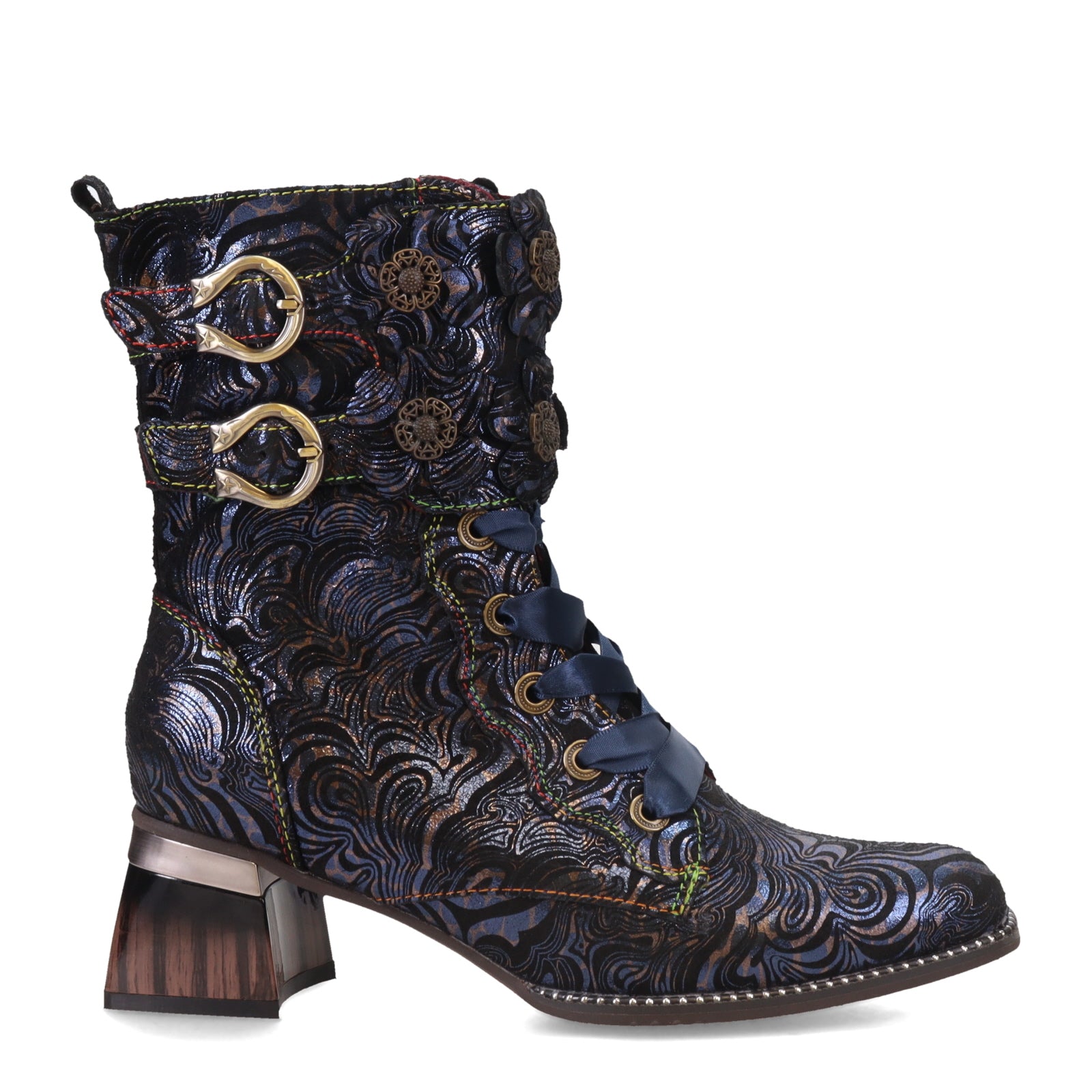 • Design details include: antique brass lucky horseshoe buckle and filigree button embellishments, dimensional applique flowers, a shiny striated chunky pewter trimmed heel and a silver studded welt sole